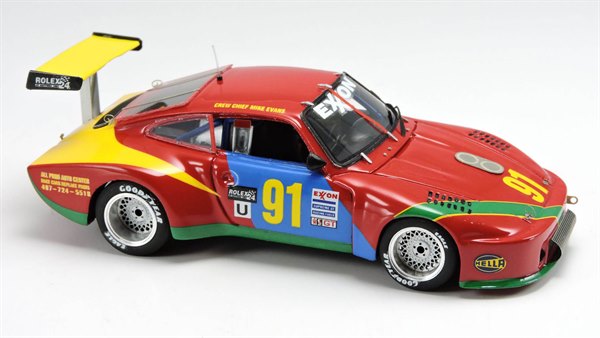 The photos that we have found of this very distinctive 911 are from Sebring rather than Daytona but the basics are the same with just a slight change to the striping on the front wing. It was a tube frame car and the front end is pure 935, while at the rear we see a unique design with extended rear corners coming to a point and a tall central wing on an etched mount. The yellow, blue and green sections of the livery are all included on the decals meaning the main paint finish is a simple bright red. The green sections of the decal are a little dull but it will still make an interesting and striking model.