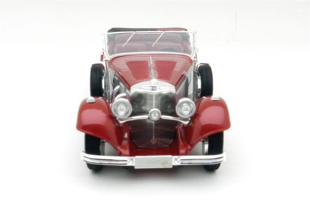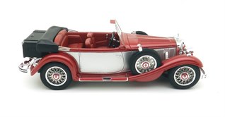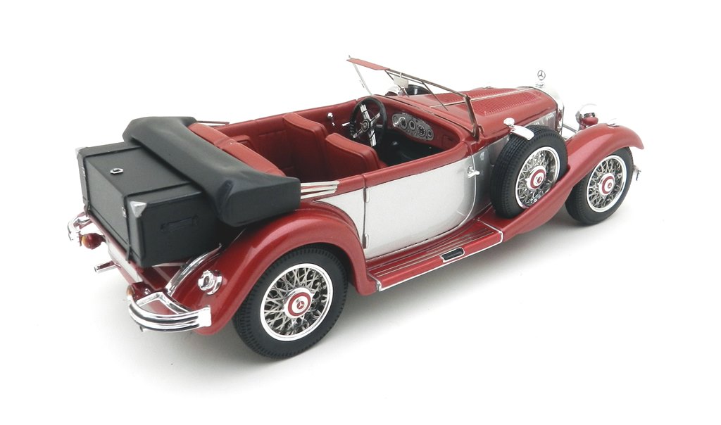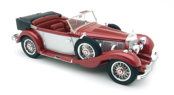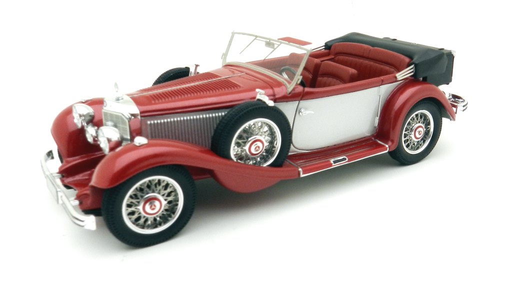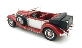 Mercedes Benz 500K Tourenwagen 1935 OpenAlternative version CAR4391 Silver roof up CAR4392 Black roof down & CAR4393 Beige roof upUsually when a model maker provides us with a chassis number (in this case 113663) it makes research rather simpler but all we’ve been able to find are photos of the car at the Essen Techno Classica show with little information. The subject is a handsome open four-seat tourer and the model is very smartly presented in a deep red with cream side panels. The red on the model is actually a very fine metallic and is complemented by a similar solid satin shade on the interior. The small details are neatly fitted and overall it makes for an attractive miniature.