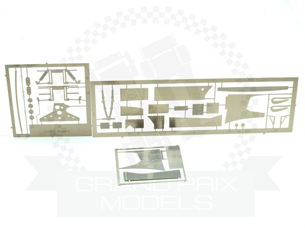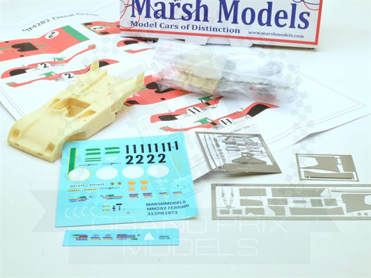 When it rolled out of the truck at the Nurburgring, chassis 0890 wore very different bodywork to that seen on 312PBs in previous sprint races. The nose was re-profiled but the significant changes were at the rear with a new rear deck that had a low centre section to direct air more efficiently through a modified rear wing, the oil cooler relocated to the right-hand side of the car necessitating a large intake in the sill and a tall airbox. Pace and Merzario drove and finished second in a formation finish. The car appeared twice more in this format, again with the same drivers, but with a slight change at the front incorporating more vents. These are moulded into the body, so will need filling if making the first version and this is detailed on the instructions. Care will be needed when assembling the rear wing as split etched fins must be wrapped around the element before painting. Otherwise it is a typical Marsh kit with very clean castings and should be a straightforward build.