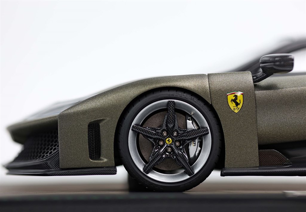 To create the F80, BBR used its know-how from 40-years company. Thanks to research and innovation, part of its DNA, BBR has obtained a higher quality model. Some examples? The rims of this F80 perfectly replicate those of the real car thanks to a new pad printing method. Furthermore, the appendages that flank the roof and descend towards the side windows were created thanks to a printing procedure improved over time. The results are appendages detached from the line of the car, a very faithful imitation of the real car. In short, BBR has also overcome the difficulty of modelling the "empty" spaces and has not chosen the easier way of a single block, "full" of resin.A dream car like the F80 deserves only these quality details.