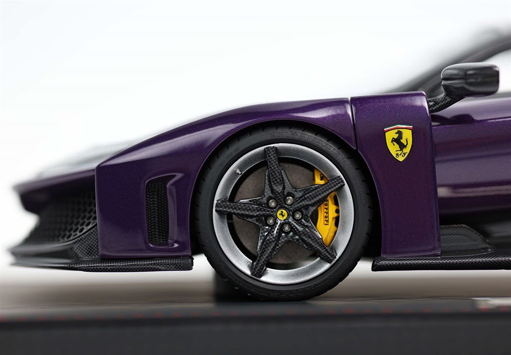 To create the F80, BBR used its know-how from 40-years company. Thanks to research and innovation, part of its DNA, BBR has obtained a higher quality model. Some examples? The rims of this F80 perfectly replicate those of the real car thanks to a new pad printing method.Furthermore, the appendages that flank the roof and descend towards the side windows were created thanks to a printing procedure improved over time. The results are appendages detached from the line of the car, a very faithful imitation of the real car. In short, BBR has also overcome the difficulty of modelling the "empty" spaces and has not chosen the easier way of a single block, "full" of resin.A dream car like the F80 deserves only these quality details.