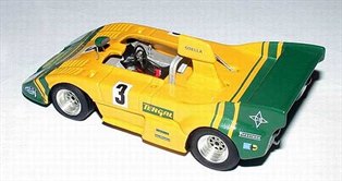 Run by Escuderia Montjuich, this pretty yellow and green Osella finished fifth overall at Enna Pergusa in 1974. The basic shape of the model looks good but for some reason the pattern maker has doubled up the main roll-over hoop, a single item clearly visible in the real car photos included with the packaging. The finish is very good and for the most part the decals are accurately placed, although on our sample the side numbers were mounted too far up the doors.