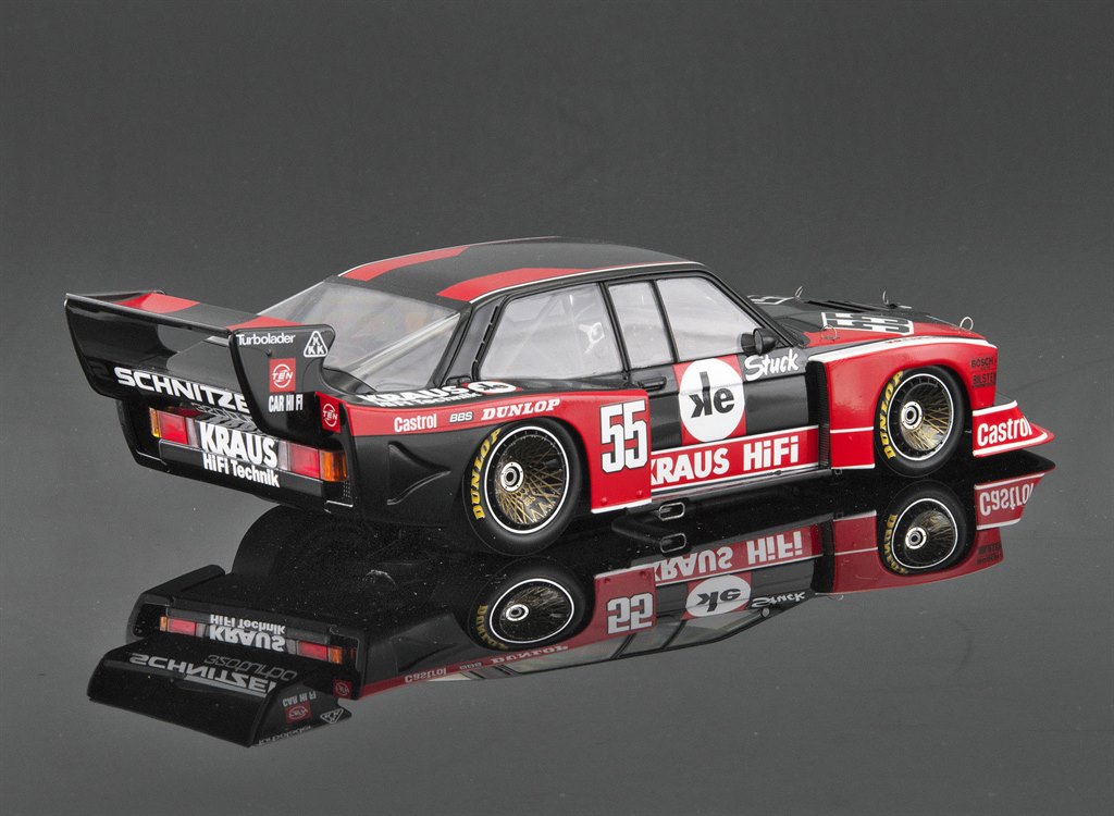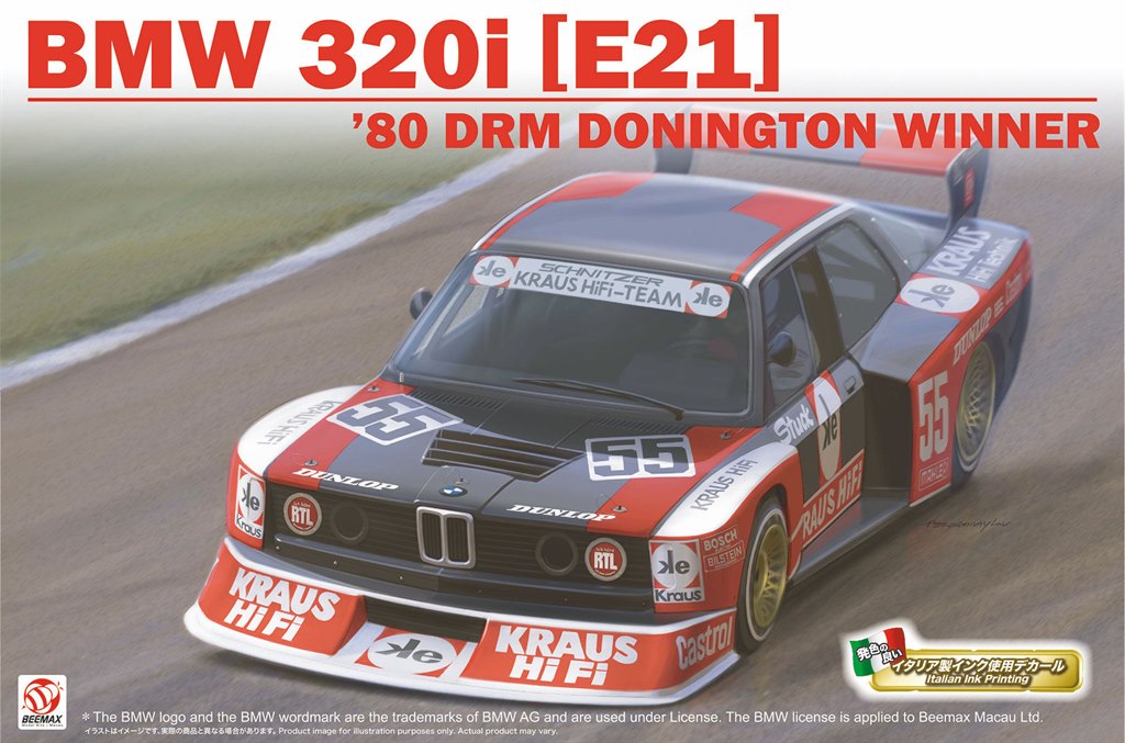 This is a 1:24 scale plastic model assembly kit that recreates the iconic BMW E21 320i racing car that competed in the 1980s German touring car race series DRM (Deutsche Rennsport Meisterschaft, or German Racing Championship in English). This particular car was driven by Hans-Joachim Stuck who had four wins in 1980 and finished second overall in the standings.