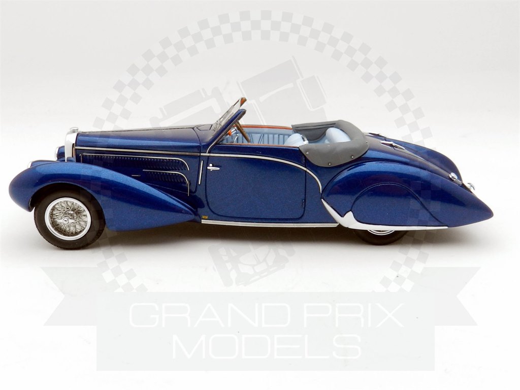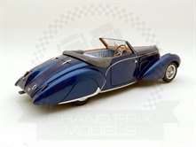 Carbone describe this as being the original version of the very rare Gangloff-built Aravis design but there are subtle changes from the original, most notable being the extension of the dorsal fin, which originally was a few inches shorter to allow a French number plate to be mounted beneath it. The details are correct for the car as it appeared for sale in 2006, the bodywork having been given a fresh coat of the original metallic blue some years earlier. The paint on the model is stunning, the colour really popping under the lights. The small detail trim is neatly fitted and the pale blue interior and grey hood cover have subtle and realistic finishes.