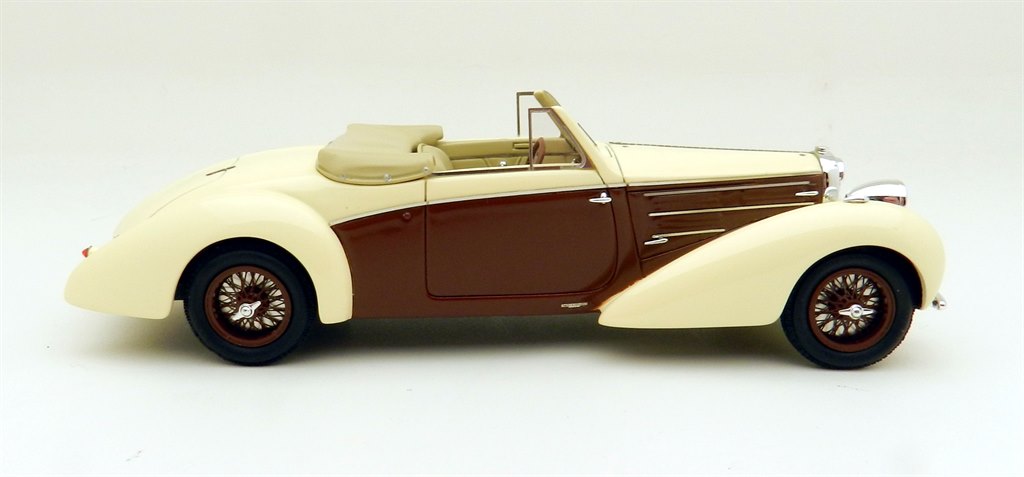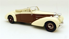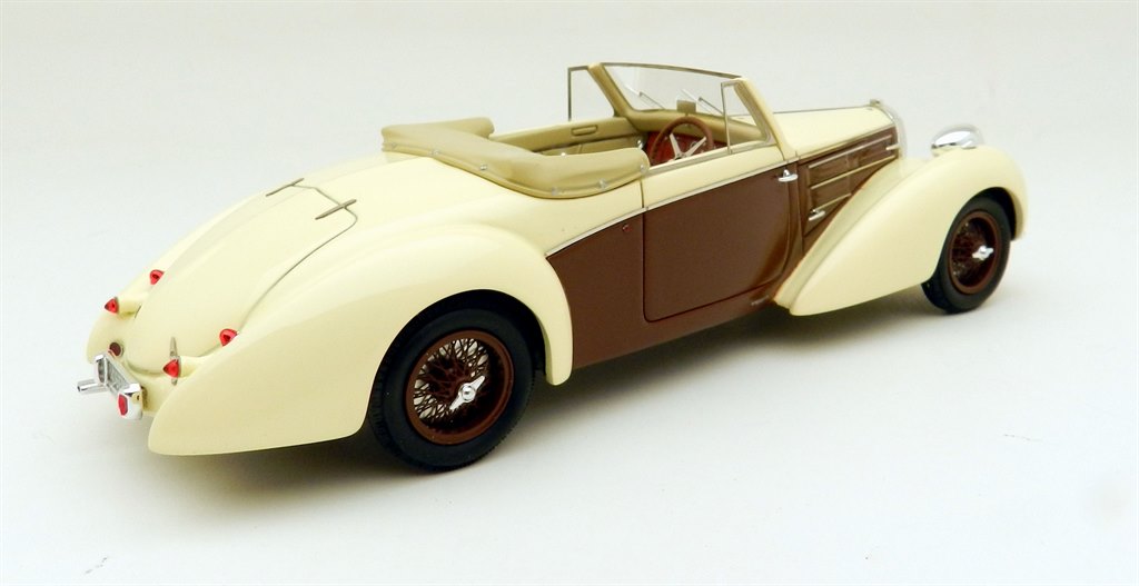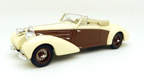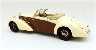 This very elegant two seat tourer in the Aravis style was one of a handful built by Letourner & Marchand and one of only three known survivors. This may have been helped by its early celebrity owner Maurice Chevalier who owned the car for a number of years. Period photos of him at the wheel show the car with the folded roof exposed, rather than in a hood bag as seen on the model and this raises the line slightly in that area. The overall shape of the car looks good otherwise and the window areas are particularly fine, as is the interior detailing.