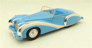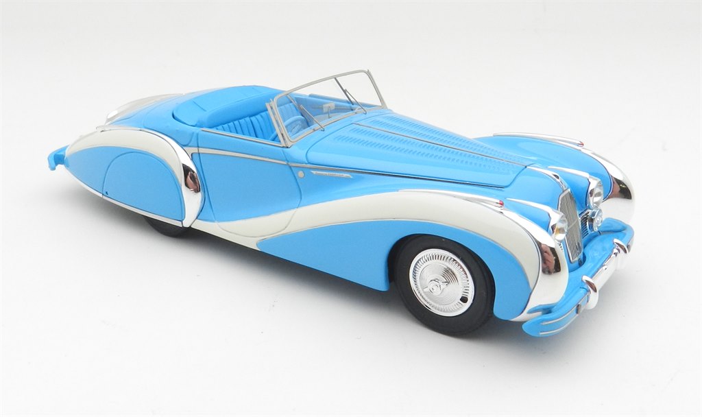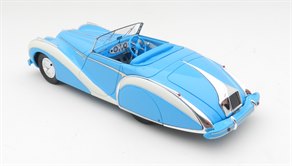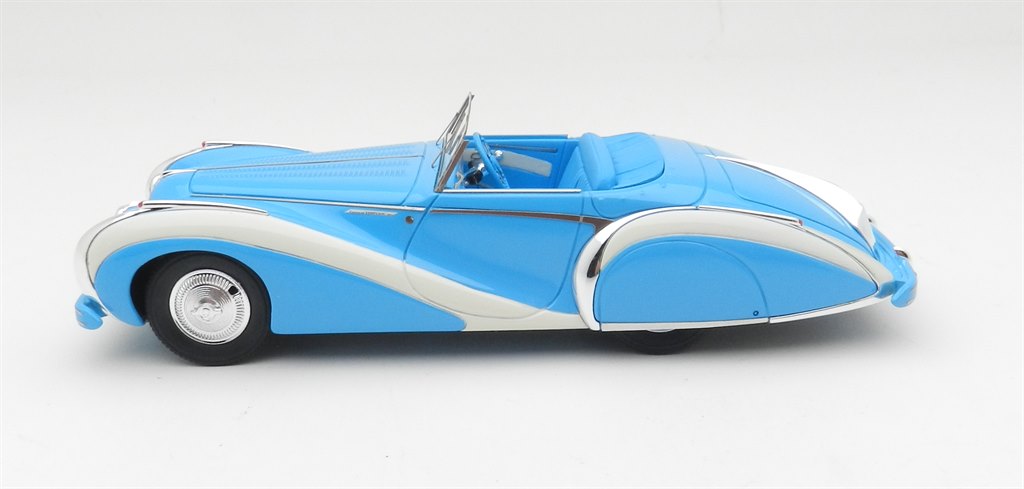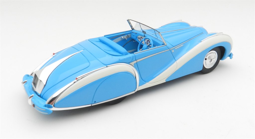 Chassis 110110 was originally shown by Talbot Lago and Saoutchik at the 1949 Geneva Motor Show and was purchased soon after by New York furrier Louis Ritter, a man with flamboyant taste to say the least. Over a number of years, the car changed hands many times and the body and chassis parted company, the latter rebuilt in the 1970s with a sports-racing body, while the original coachwork was lost. The car has since been restored (or rather authentically recreated) and the model depicts it as it was offered for sale in 2015. It’s a dramatic design and the two-tone blue and cream paint with chrome highlights is all neatly reproduced over the flowing lines and the colour scheme continues through the interior.