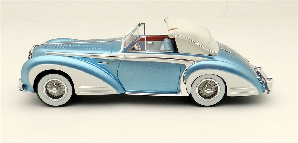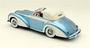 This rare four seat convertible by Chapron was displayed at the 1948 Paris motor show and is modelled here as it appeared again in Paris some years later, at the 2015 Retromobile event. The two-tone cream and pale metallic blue paint finish is expertly masked, with sharp panel lines helping with the separation of colours. There is plenty of very fine trim neatly fitted and the roof, with the front section rolled open, adds great character to an already attractive miniature.