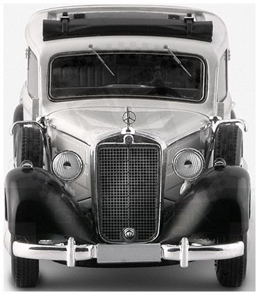 The Mercedes 260D was one of two diesel engined passenger cars (the other a Hanomag) launched at the 1936 Berlin motor show, the first commercially available diesel cars. Several body styles were available and approximately 2,000 were built between 1936 and 1940. The car modelled has a two section opening roof and our black sample has the rear portion open. The basic shape of the car looks good and the overall finish of the model is to a high standard. The detailing is of a more traditional diecast style, so we see plenty of moulded plated parts including the handle for that open roof.