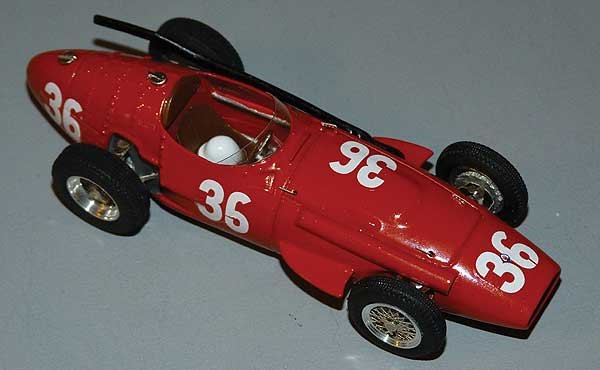 Maserati prepared two special low line cars for the 1956 Italian Grand Prix, the driver sitting much lower thanks to an offset propshaft and driving position. Moss won first time out with the car and in hand built form here the model is very well finished and matches the real car photos included with the kit parts. A fun bonus is a painted crash helmet to be posed maybe in the seat or on one of the stone guards.