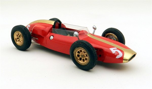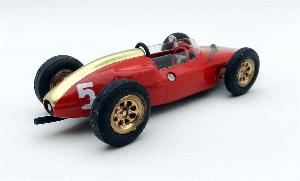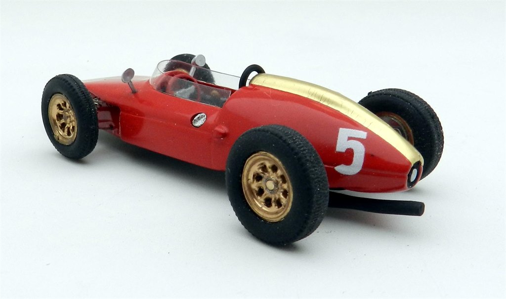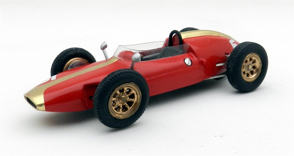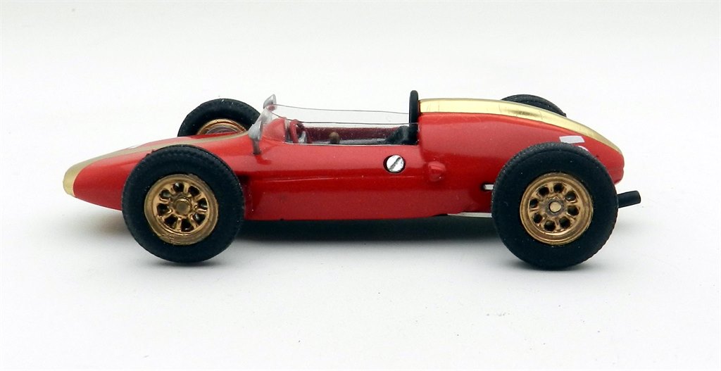 The Heron Formula Junior was designed and built as a Formula Junior machine with a Ford engine but the first owner, Tony Maggs, soon added a Climax unit and in 1960 took the car to his native South Africa for the GP. He didn’t start due to mechanical issues and in the end sold the car to local racer Ernest Pieterse who fitted his favoured Alfa Romeo engine. With the car in this form he won the Rand Spring Trophy at Kyalami in the November and a few weeks later also entered the South African GP, finishing sixth overall on the same circuit. It is the former version which is depicted here and Jade has handily included photos of the car in action to compare the model with. Overall it looks pretty good. The gold stripe down the centre of the car has been applied using a foil, which has hair-line creases on some of the more complex curves, but conforms pretty well. The main red paint finish is excellent beneath and overall the assembly is neatly done, including a bit of dirtying of the wheels.