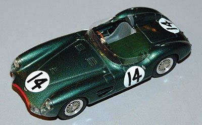Aston Martin DBR1 Le Mans 1956 #14 Le Mans 1956 saw the debut of Aston Martin’s new tube frame DBR1 sports-racer and in original form it was nowhere near as flowing in line as the cars that we are familiar with from the following years. Jade have captured the shape of the car pretty well and the main casting in their kit are very crisp with precise panel engraving. The tonneau cover is moulded in situ and marries up with the dash panel very neatly. These kit parts are in typical Jade style with much of the detailing such as the exhausts integral with the body shell.