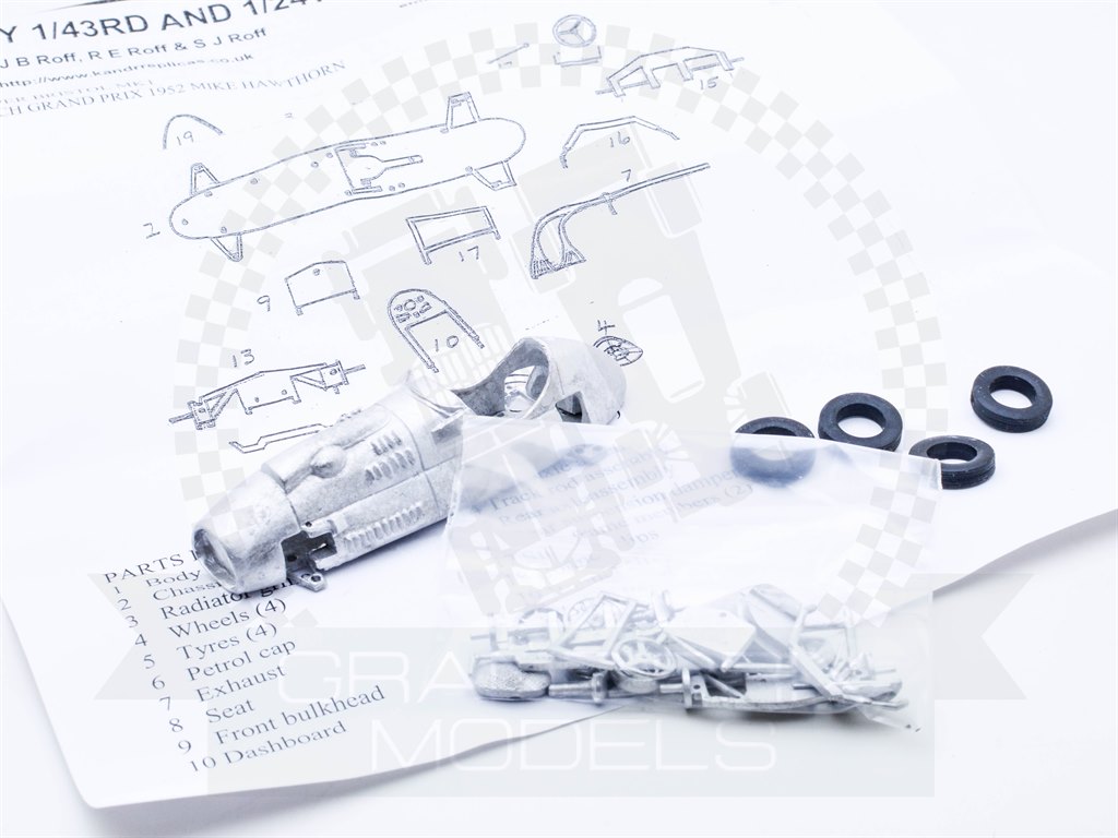 Having exploded onto the racing scene early in 1952, Mike Hawthorn’s reputation was rapidly growing through the year and in Holland he briefly mixed it with the Ferraris before succumbing to their superior power and settling for a comfortable fourth place, perfectly poised should one of the Italian machines run into trouble. K&R’s kit is well cast and captures the specific body details of the car accurately to make another great addition to any Cooper, Hawthorn or GP collection.
