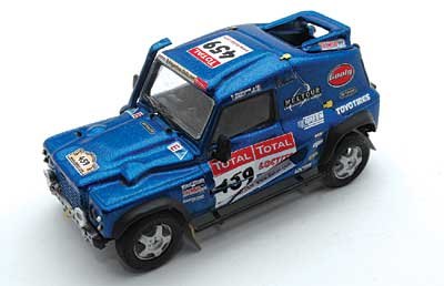 Drew Bowler’s Land-Rover derived off-road racers are becoming more and more popular with private entrants on the Dakar and this is one of a pair of cars entered on the 2009 event by the Humily family from France, though neither appears to have made it to the end of the gruelling event. The model is generally well built with a fine metallic blue paint finish and neatly placed decals which have been particularly well done around the very complex shapes on the sides of the vehicle. Some of the detailing is a little wobbly but overall a good looking model.