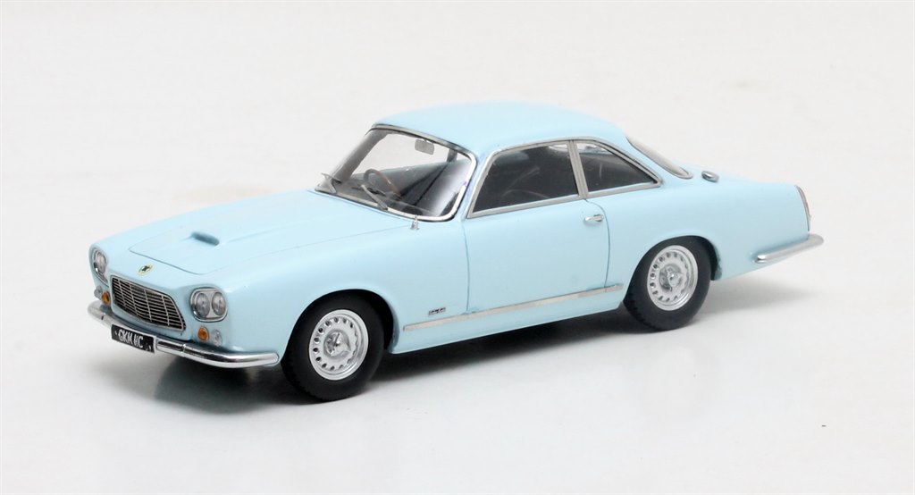 When first unveiled in 1960, the Gordon GT as it was then was well received by the motoring press, it’s sharp Italian suit (Giuriaro’s first design at Bertone) covering a spaceframe chassis and Chevrolet V8. For production the body was made in fibreglass by Williams and Pritchard but it is the original car that we see here. The overall shape of the car is well captured and the pale blue paintwork is very good. The Jaguar D Type-style Dunlop disc wheels are very neatly made and there are fine etched frames for the windows, all of which fit well.