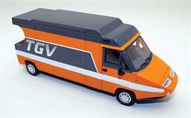 The shape of the cab doors and windscreen area are the only clues that beneath this rather bizarre coachwork there lies a Renault Master van. Two of these vehicles, styled on the French TGV high speed train, were among the support caravan for the Tour de France cycle race in 1983. The front of the van apes the train very effectively and at the rear there is a covered platform from which merchandise could be distributed. The shape of the van is superbly replicated and the finishes are excellent with neat masking between the bright orange main body colour and the grey roof, which matches the decals on the sides and around the lower edge of that platform. There have been some wonderful promotional vehicles on the Tour over the years and with more and more being modelled, they make a great collecting theme.