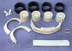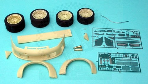 Comments: For Tamiya. Includes resin wheels, tyres, arches, front bumper, wing, mirrors, PE end plates, tow eye, filler and decal