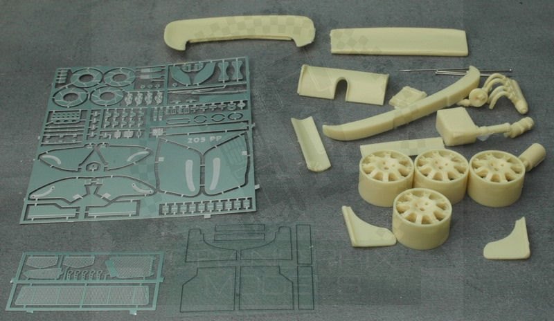 Comments: For Tamiya - Pikes Peak. Includes resin wing, venturi, wheels, canards, etched discs, calipers, grilles, decals, etc