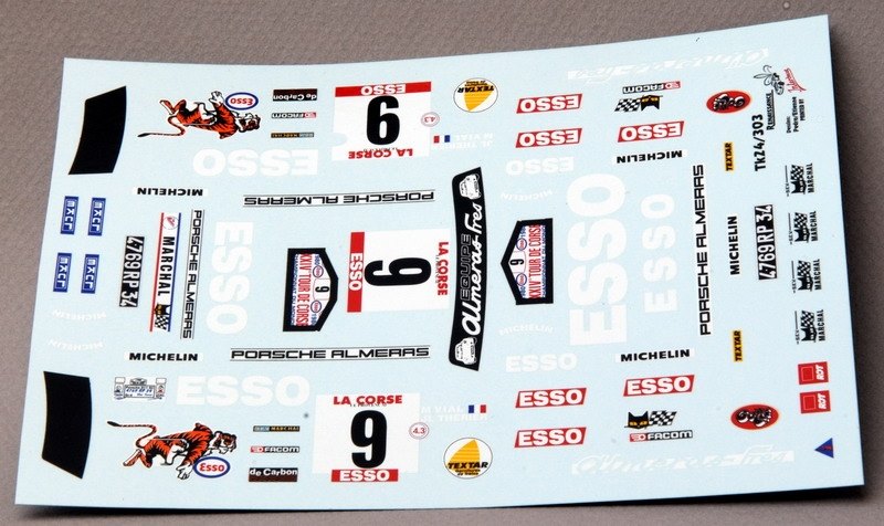 The base kit suggested for the decal sheet to make Therier’s Corsica winner is actually a 934, so some modification to spoilers and wheels will be needed. These parts are supplied in the transkit should you wish to take the easy option and take the form of a complete front bumper, rear engine cover, the wheels and spot lights. The decal set includes all sponsor logos and numbers but you will need to mask and paint the car in two tone red and blue.