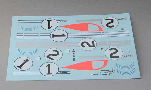 Two options are offered on each of these very clearly and vividly printed decal sheets. The winning #2 car is the simplest decoration with stripes, numbers and the New Zealand racing club logos to go over a black base. The #1 car which finished second is a pale blue base colour and this time there are also dayglo orange flashes for the tops of the front wings. The blue streaks for the Goodyear tyres are included on this sheet but no Goodyear lettering.