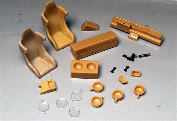 Most of the parts in this detailing set are for the interior of the little Renault rally car, with seats, a fuel cell, helmet box and dashboard but there are also smaller parts to go outside including additional lamps, exhaust tailpipe and body fasteners.