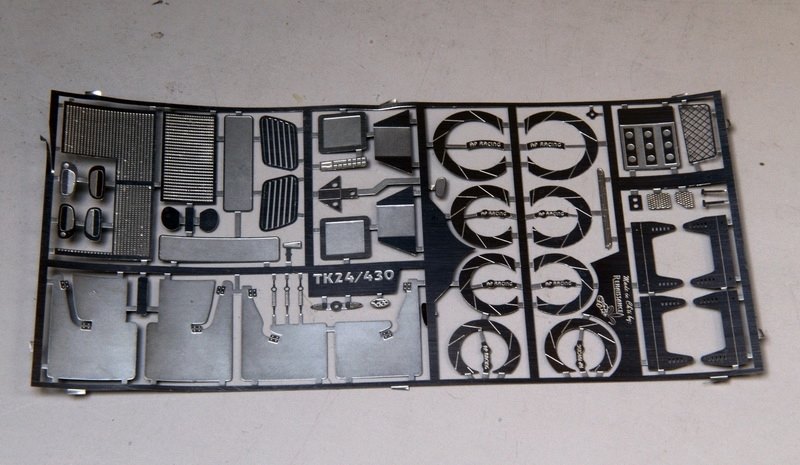 This relatively simple etched set is for the original four door Impreza rally cars and includes various grilles, brake facings, roof vents, door handles and mud flaps for the outside of the car and seat brackets, pedal pads, co-driver’s footrest and a few dashboard details for inside.