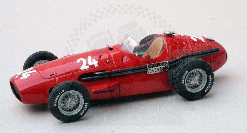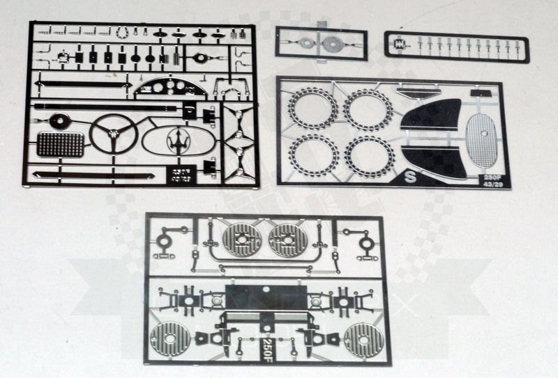 Many drivers appeared in factory prepared Maserati 250Fs during the 1955 season and this kit offers no fewer than twenty-eight possible driver and race combinations! Behra, Musso and Mieres were the full timers and so we see cars for each of them from all six races. The instructions concentrate primarily on the assembly and for decoration there is just one version from each race illustrated to show number positioning and whether stone guards are needed, the rest of the information is in a table.