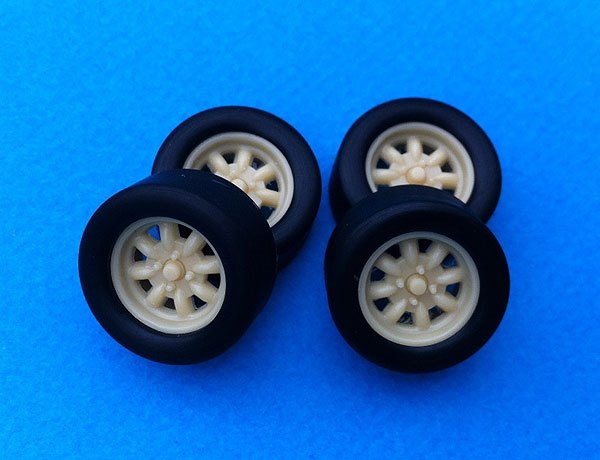 Minilite 13” Wheels & Tyres (x4) 1:24 Made to fit Belkits kit BEL006 & BEL007 A very nicely cast set of resin wheels supplied with soft resin slick tyres. Ideal if you’re building a diorama or modifying the Belkits Escort.