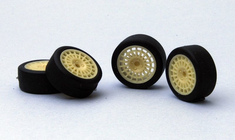 Speedline 17” Wheels & Tyres (x4) 1:24These well cast Speedline wheels with low profile slick tyres and a four-stud fixing are ideal for a tarmac specification Lancia Integrale. There are feed tags to remove but very little flash.