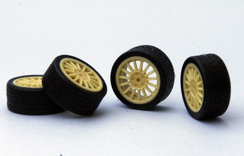 OZ 18” Wheels & Tyres (x4) 15 Spokes 1:24With semi-treaded tyres and a five stud fixing these cleanly cast wheels are intended for use with Belkits VW Polo WRC cars.