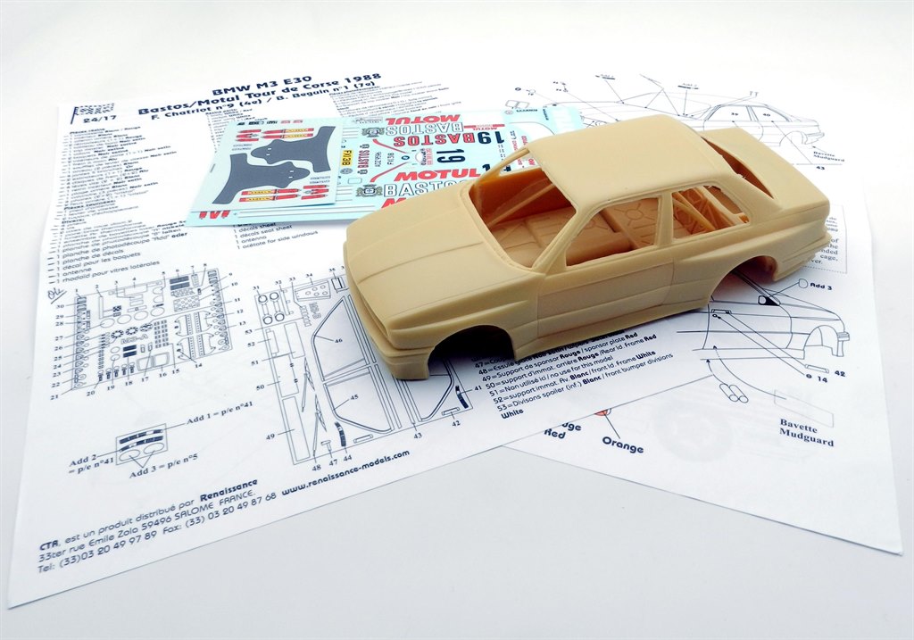 Renaissance’s M3 rally car kit first appeared back at the end of 2003 and there have been several variants since. The parts are well cast with just a small amount of flash to remove and there’s a good level of cockpit detail both in resin and among the several photo-etch sheets which also include plenty of exterior finishing touches. The decals this time offer two options with a pair of near identical cars driven by Francois Chatriot (4th) and Bernard Beguin (7th) on the Tour de Corse. The decal is also available as a separate set should you prefer to use a plastic kit as a base. Whichever route you choose, a two-tone paint finish will be needed and this is simplified with the inclusion of red decal for the rear pillars and a white panel for the back edge of the bonnet.