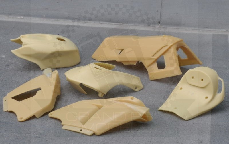 Intended for the first of Tamiya's many kits of the Honda RC211V, this pack contains six fine resin castings to more accurately depict the fairings, seat base and tank for the first evolution of the original V5 Honda, as ridden by Valentino Rossi.