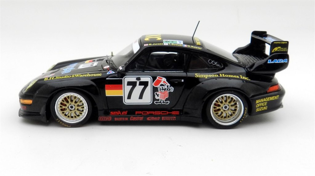 This smart black Porsche was entered by Seikel Motorsport and showed plenty of pace early in the race, clawing back several places lost after starting from the pit lane, only to lose a huge chunk of time when it ran out of fuel, the driver managing half a lap on the starter motor! It did finish the race eventually. The paintwork on the model is excellent and the layout of the decoration is well done, although the red logos are quite dark compared with race photos in varying light.