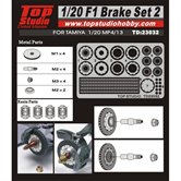 For Tamiya kit TAM89718 It's amazing just how many parts can be added to a well detailed plastic kit and here we have a comprehensive brake set. The discs are supplied as machined metal and there are more metal parts for the threaded mounting spindles and wheel nuts. The machined metal disc base is then detailed with several pieces of photo-etch and there are resin callipers.