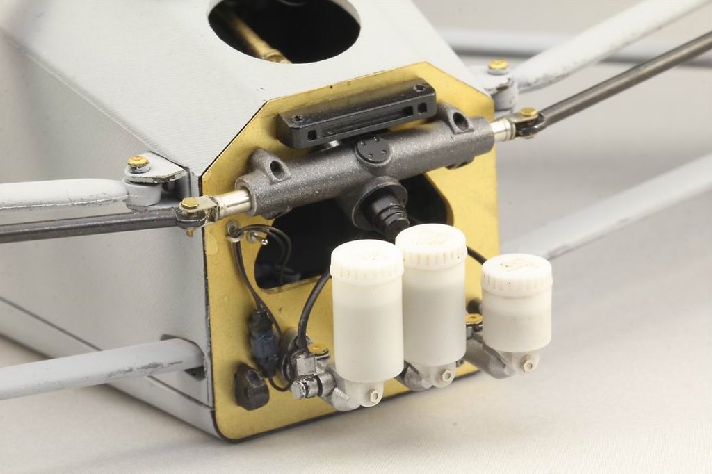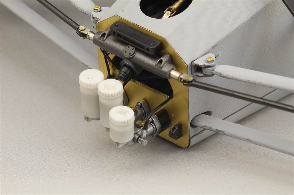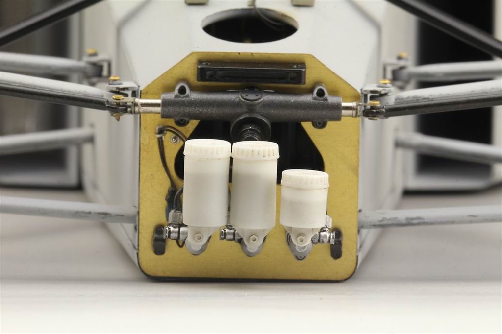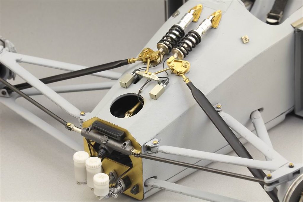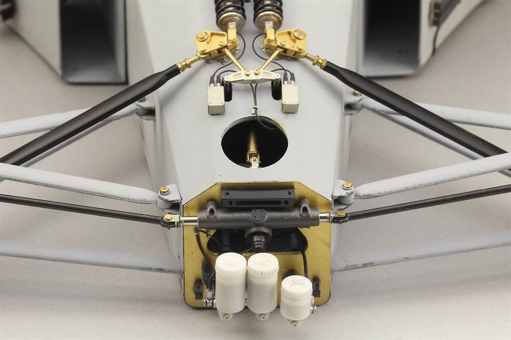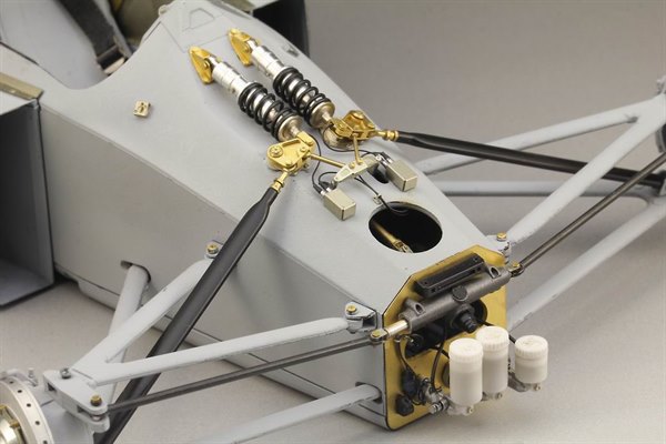 The first stage of fitting this detailing set is to carefully cut the front off the monocoque in Tamiya’s kit. This is then reattached using tiny screws and brackets, the bulkhead within replaced with etched parts. There’s a new steering rack, brake and clutch master cylinders, replacement suspension push-rods and complete shock absorbers with complex etched mounting brackets and bell-cranks. Plenty to keep the most avid builder busy, especially when combined with Top Studio’s other sets for this kit.