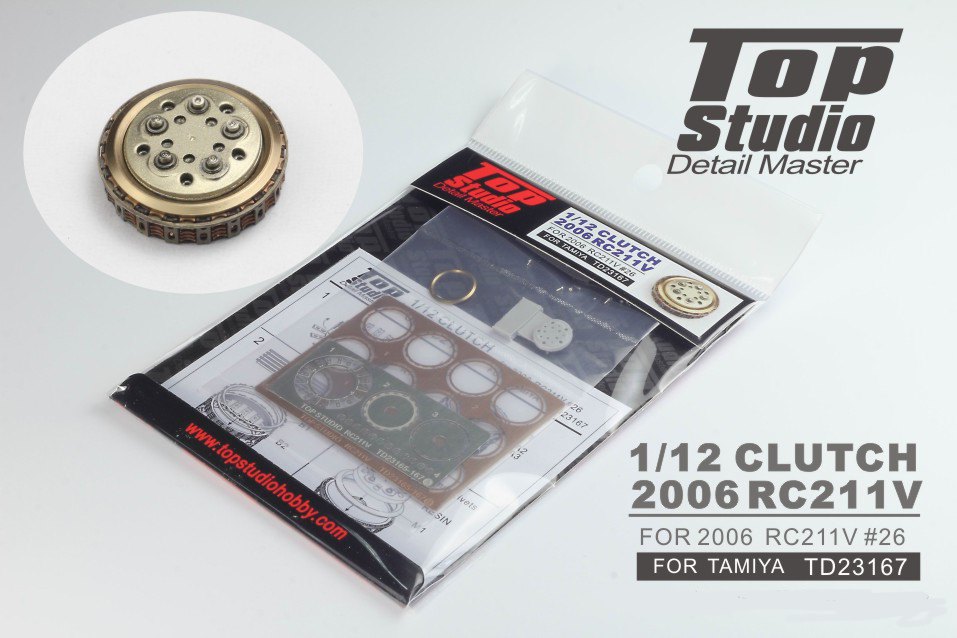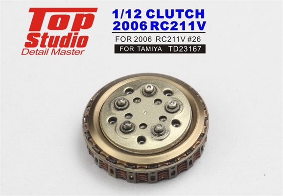 Honda RC211V Clutch 2006Made to fit Tamiya kitsThe design of these clutch detailing sets all follow a very similar pattern with a sequence of fine etched brass plates to be stacked into an etched stainless steel cage. That cage needs careful bending and slotting together and there is a resin centre cover. Each is a slightly different design to reflect the specific bike and all will add subtle detail to your model.