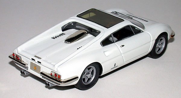 Based on the chassis of a 365P2 endurance racer, just two examples of this novel three-seat mid-engined GT were built. The car seen here was the first, delivered to Luigi Chinetti of NART early in 1966, the second example coming a few months later for Fiat boss Gianni Agnelli. The Pininfarina styling is very similar to the Dino, launched the same year, but the wide body to accommodate the three-abreast seating and a clear roof panel help the car stand out. Tron offer two separate kits for the different chassis but could easily have included both versions in one as the only difference we can see is the inclusion of a plated casting for the large rear spoiler in the Agnelli car. This car was originally silver and then restored in red offering further options. The main castings in the kit will need a little careful clean-up, particularly around the recessed lips for the flush-fitting windows.