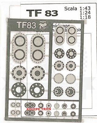 Fuel Fillers - Photoetched 1:43/24/18This handy etched fret will be useful to modellers in three scales. There are single and double fillers offered with fourteen pieces in 1:43, ten in 1:24 and six in 1:18.